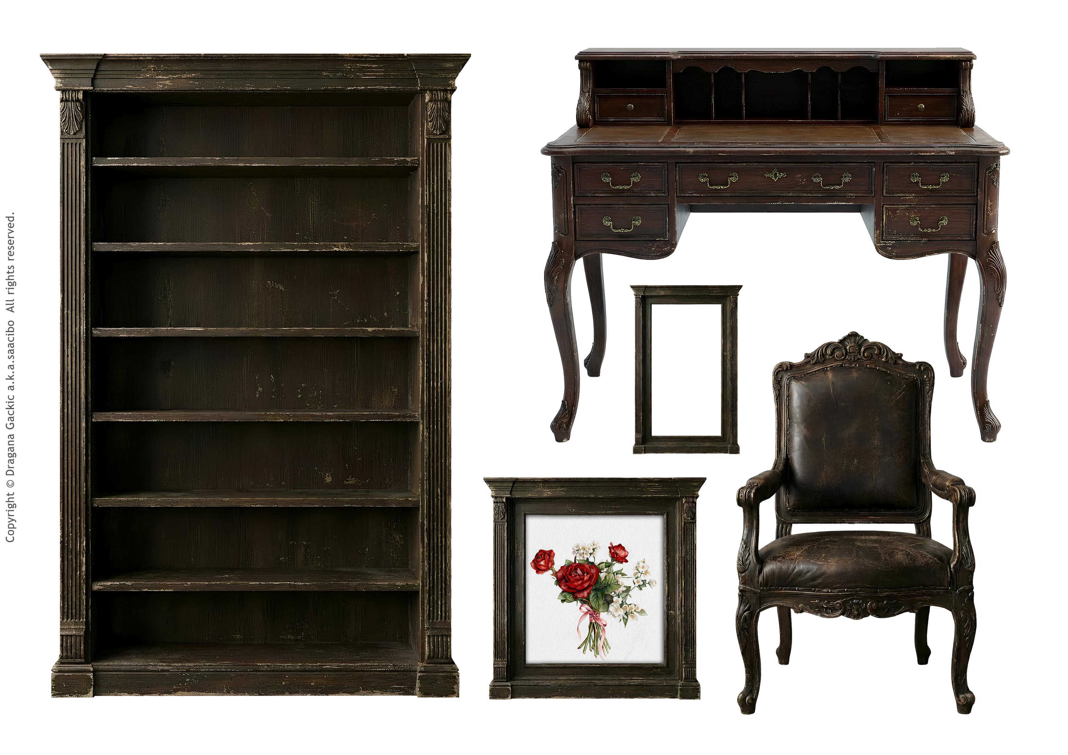 Vintage Study Room – Dark Wood – Printable Furniture, Bookcase, Desk, Chair